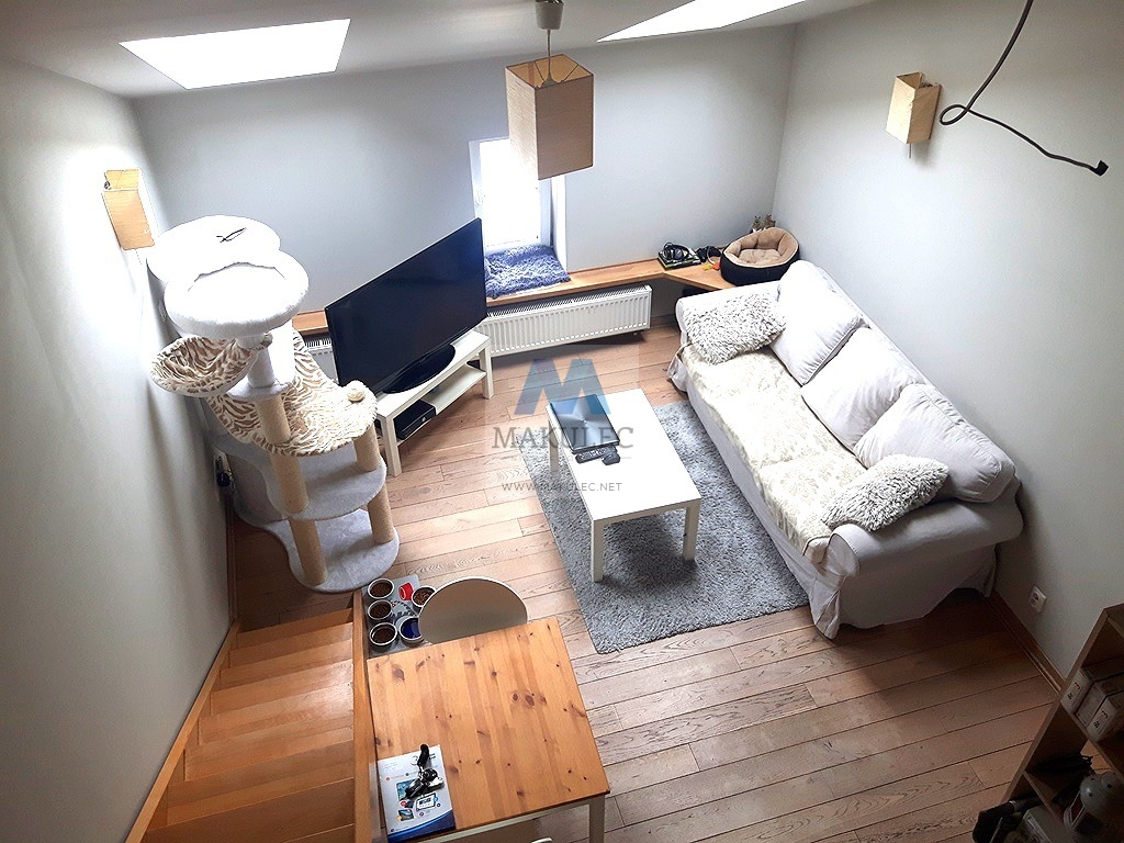 Nietuzinkowe, bardzo oryginalne mieszkanie zaprojektowane przez dekoratora wnętrz ze skosami i dwiema antresolami ! Jedna antresola o powierzchni ok 5 metrów znajduje się nad aneksem kuchennym (obecnie wykorzystywana jako biblioteczka) natomiast druga o zbliżonej powierzchni nad łazienką i korytarzem. W najwyższym miejscu lokal ma ok. 5 metrów wysokości.