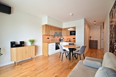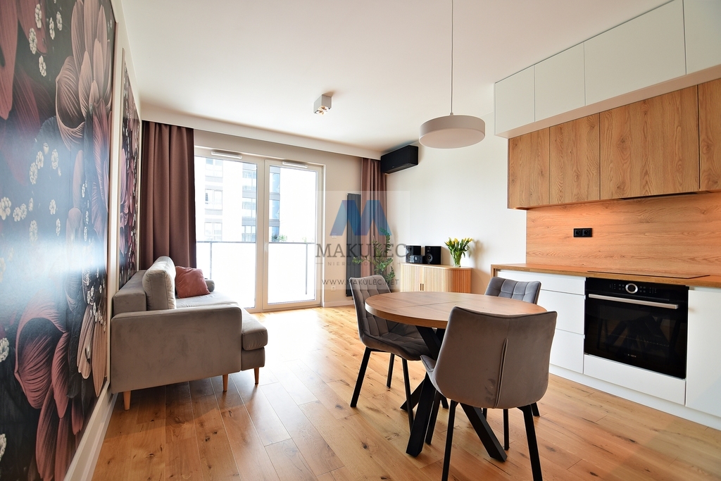 Salon z aneksem kuchennym o powierzchni ok. 24 m2. Z niego znajduje się wyjście na balkon ok 5 m2. W przyszłości z balkonu będzie widoczny skwer, który ma powstać zgodnie z MPZP. Meble kuchenne zostały wykonane na wymiar przez stolarza. Kompletny sprzęt AGD firmy "Bosch". Na podłodze we wszystkich pokojach i większości przedpokoju znajdują się dębowe deski. W salonie zamontowana jest wysokiej klasy klimatyzacja firmy "Daikin" (z możliwością ewentualnej rozbudowy).