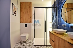 Nowocześnie urządzona, duża łazienka o powierzchni 6 m2 z wysokiej klasy armaturą "Grohe", z dwoma umywalkami. Wygodna kabina prysznicowa o wymiarach 120/90cm. W łazience i sypialniach pełne drzwi bezprzylgowe firmy"Porta". Całość dopełnia przestronny przedpokój.