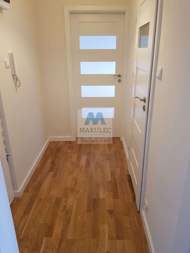 Mieszkanie składa się z dobrze doświetlonego salonu o powierzchni ok 17 metrów z którego znajduje się wejście do widnej ok. 4 metrowej kuchni. Powierzchnia łazienki wynosi ok 3 metrów a oddzielnej sypialni ok. 11 metrów. Z niej znajduje się wyjście na balkon. Nowe okna i parapety a także drzwi wewnętrzne. Na podłogach w pokojach i przedpokoju położona jest deska barlinecka. Natomiast na podłodze w kuchni i łazience gres. W kuchni nowoczesny jeszcze nie używany pochłaniacz , kuchenka z piekarnikiem, zmywarka oraz lodówka. Mieszkanie zostało pomalowane ekologicznymi farbami firmy "Flugger".